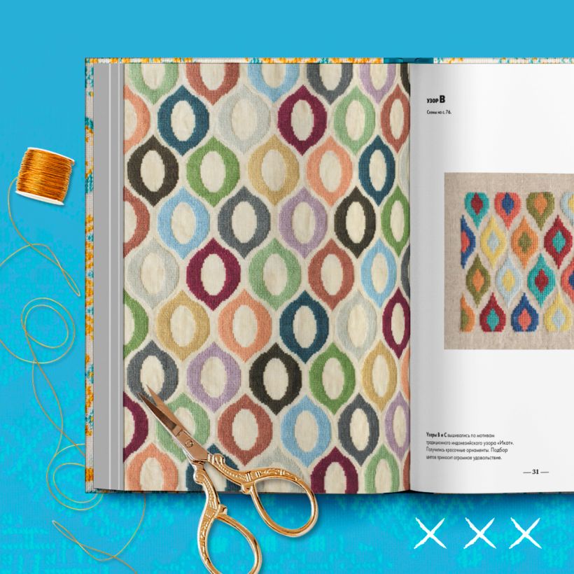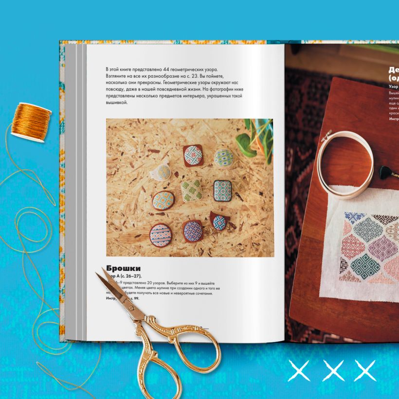 • 44 ярких геометрических узора крестиком и счетным стежком.