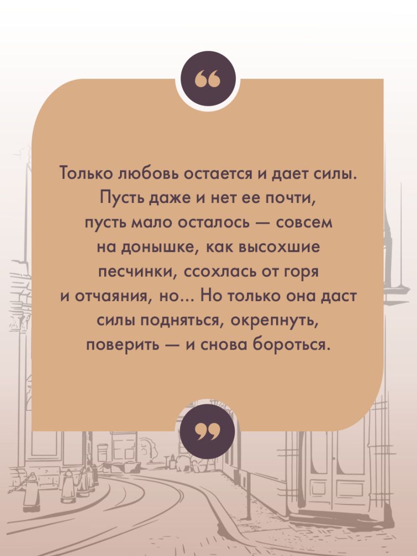Когда-то брошенная сама, Лиза не способна на предательство. И она бесконечно борется — за жизнь родных, благополучие дочери, собственные чувства... Но не было бы счастья, да несчастье помогло: в Лизиных руках появляется новое хрупкое чудо. Хватит ли у нее сил нести его вперед?