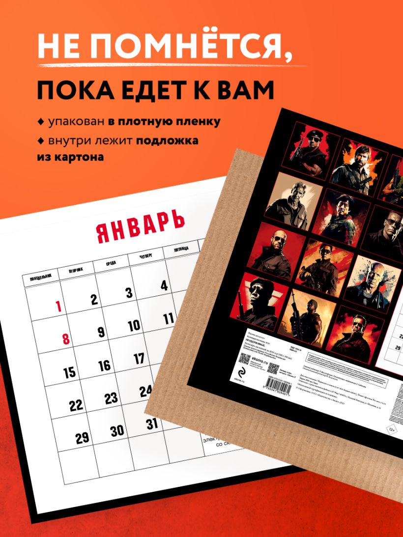 Самый мужественный и крутой календарь, вдохновленный легендарным фильмом «Неудержимые»! Качественная бумага, большой формат (300х300 мм) и креативная яркая сетка с любимыми героями! Отличный подарок поклонникам!