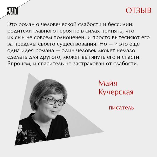 «Это роман о человеческой слабости и бессилии: родители главного героя не в силах принять, что их сын не совсем полноценен, и просто вытесняют его за пределы своего существования. Но — и это еще одна идея романа — один человек может немало сделать для другого, может вытянуть его и спасти. Впрочем, и спаситель не застрахован от слабости.