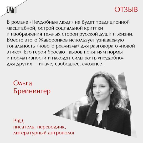 «Стилистически продолжая сложившуюся на рубеже 20—21 веков линию новой реалистической прозы, Ярослав Жаворонков решительно отходит от ее привычных тем ради смелого литературного эксперимента. В романе "Неудобные люди" не будет традиционной масштабной, острой социальной критики и изображения темных сторон русской души и жизни. Вместо этого Жаворонков использует узнаваемую тональность "нового реализма" для разговора о "новой этике". Его герои бросают вызов понятиям нормы и нормативности и находят силы жить "неудобно" для других — иначе, свободнее, сложнее».