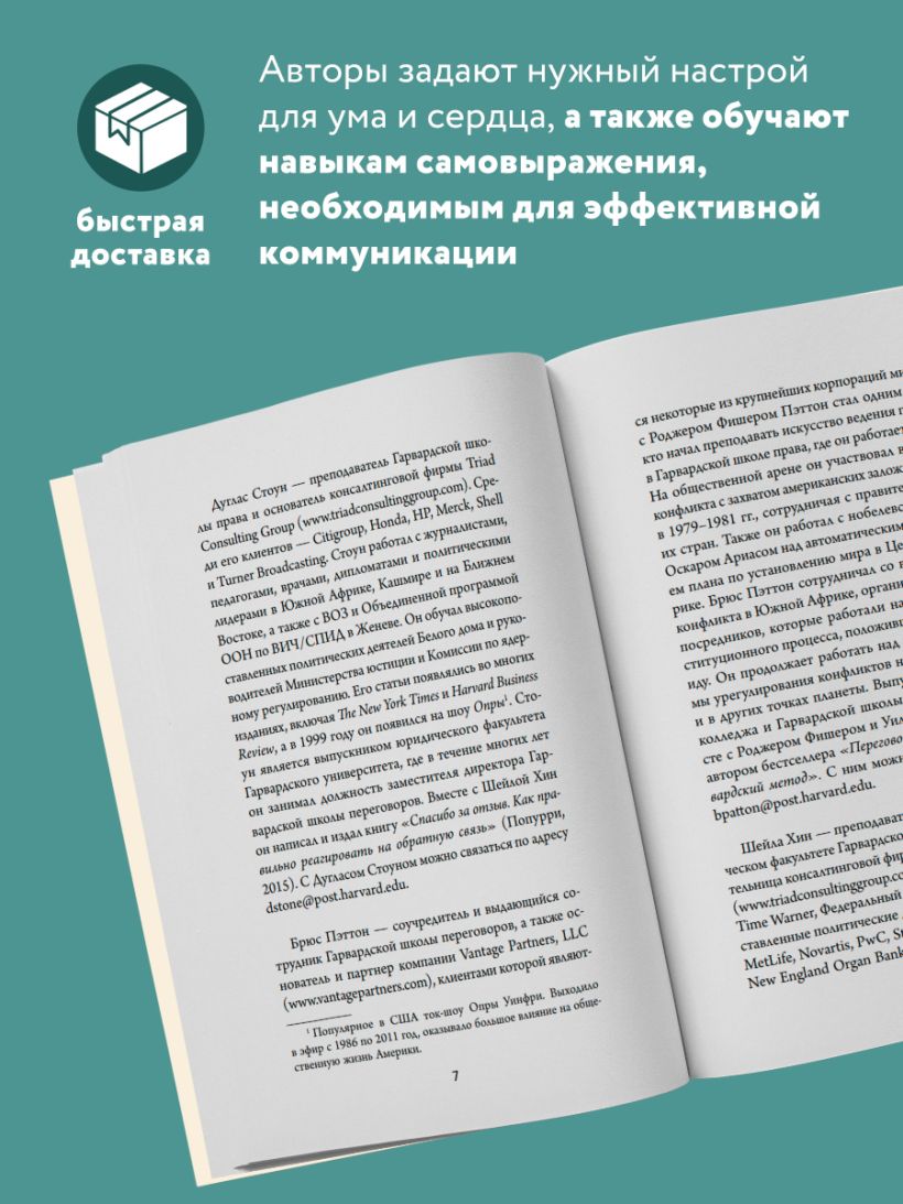 Дуглас Стоун, Брюс Паттон и Шейла Хин преподают в Гарвардской школе права и Гарвардском переговорном проекте. Они были консультантами бизнесменов, правительств, организаций, сообществ и отдельных лиц по всему миру, а также писали о переговорах и общении в различных изданиях, от New York Times до журнала Parents.