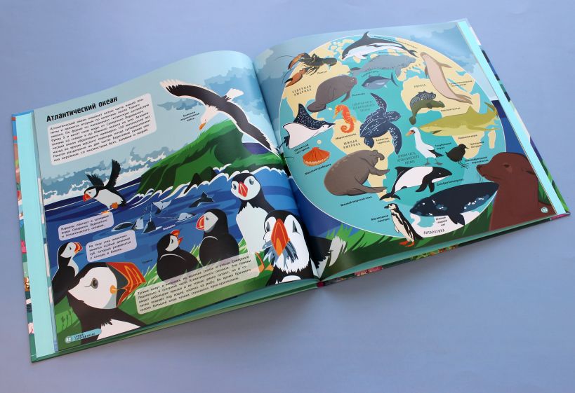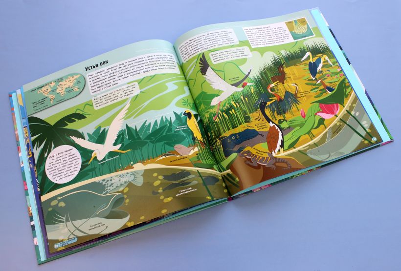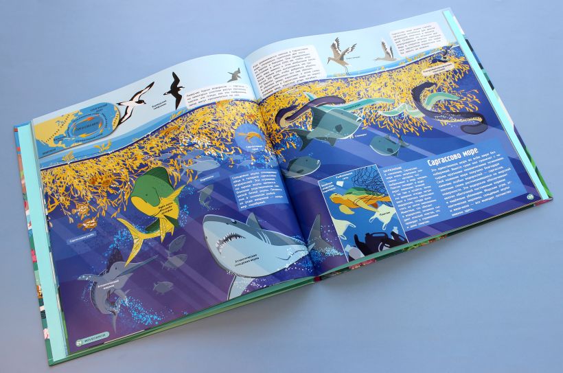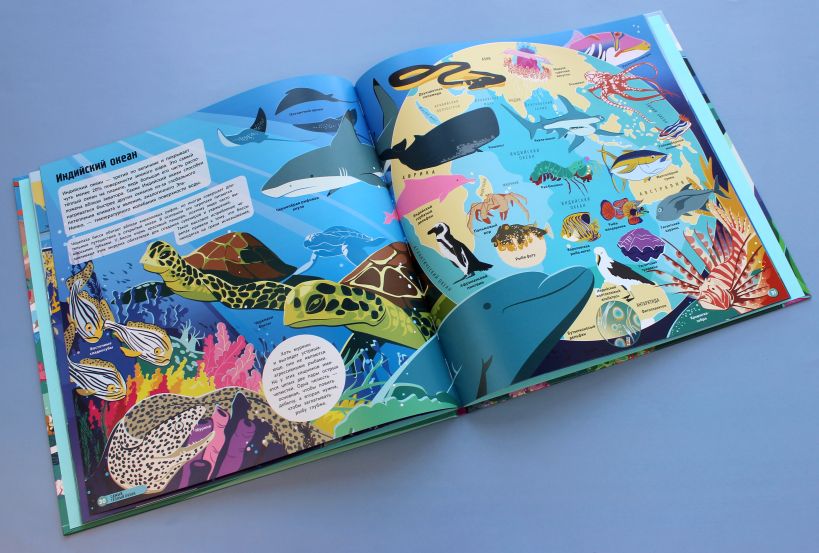 На каждом развороте — рассказ о гидросфере, течениях, глубоководных впадинах, водорослевых лугах, мангровых зарослях, коралловых рифах — и обо всех обитателях подводных и надводных экосистем, какие только есть на Земле.