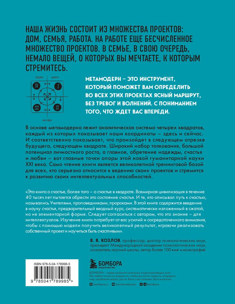 Автор книги — профессор и доктор психологических наук Павел Пискарев — предлагает нам новый метод движения вперед, к целям и достижениям. В основе метода лежит аналитическая система четырех квадратов. Которая позволяют увидеть весь пул задач и перспектив — с совершенно разных углов и в полном объеме. Книга, безусловно, рассчитана на интеллектуального читателя. Изучение ее потребует от вас усилий и сосредоточенного внимания. Однако, освоив метод метамодерна, вы получите ощутимый результат. Теперь в бизнесе и творческих задачах, в личной жизни и выстраивании правильных коммуникаций вы сможете реализоваться играючи и научиться быть счастливым. Книга снабжена цветными иллюстрациями автора.