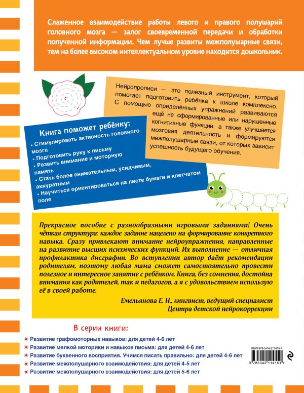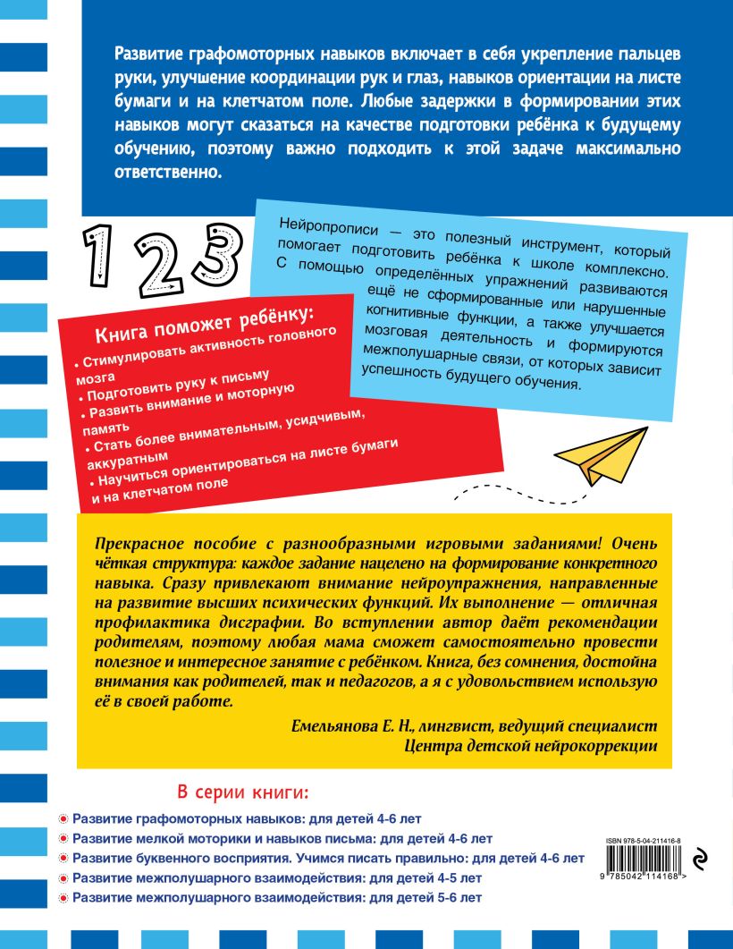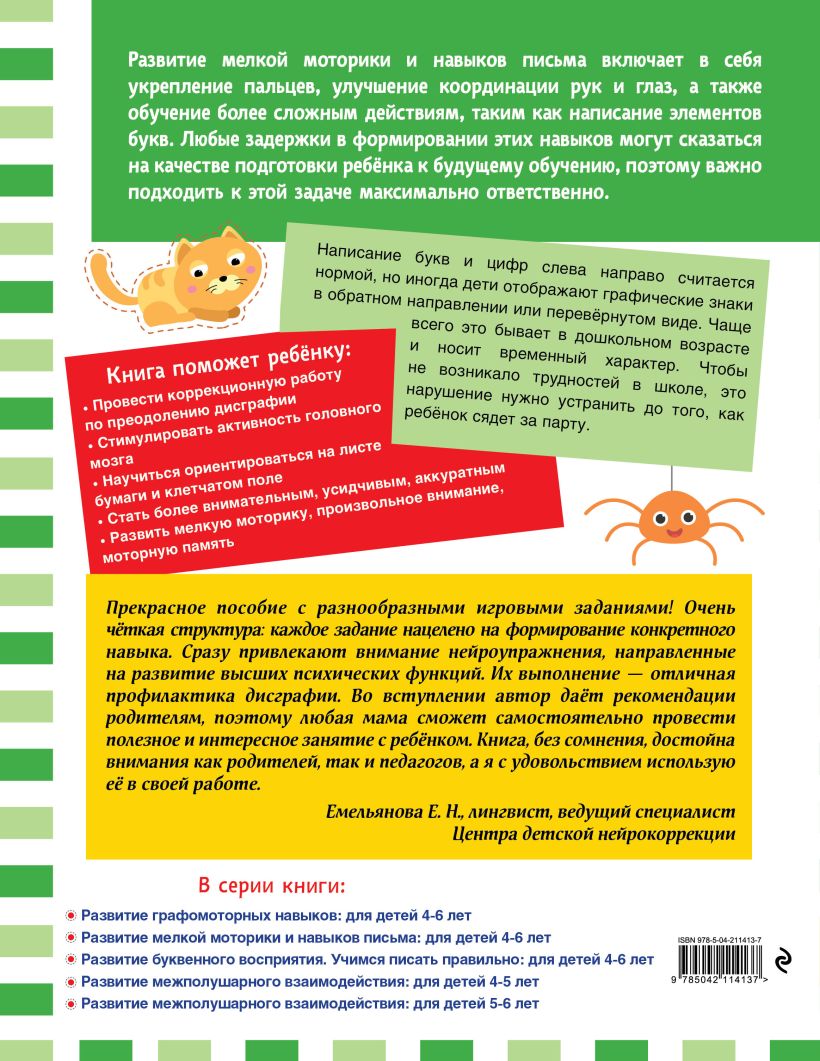 Комплект из 5 пособий — эффективная система профилактики дисграфии и формирования у ребёнка уверенных навыков письма. Каждая книга включает разнообразные упражнения: обведение линий по пунктиру, рисование по клеткам, штриховку и специальные нейроупражнения для активизации работы мозга и развития межполушарных связей. Игровые задания расположены в логической последовательности — от простого к сложному. Такой подход укрепляет координацию "глаз–рука", развивает произвольное внимание и формирует устойчивый навык письма.