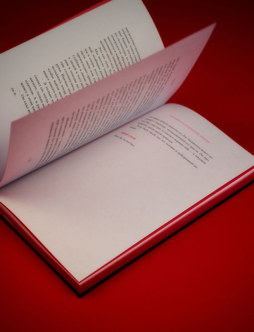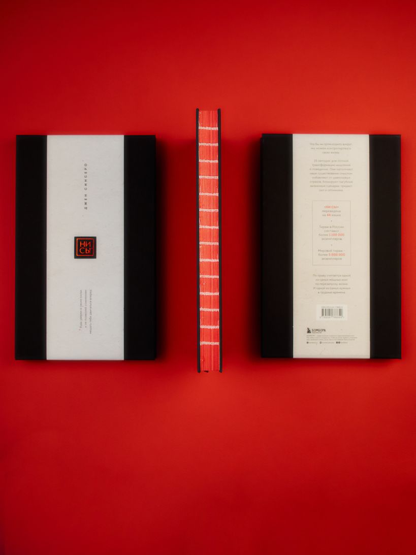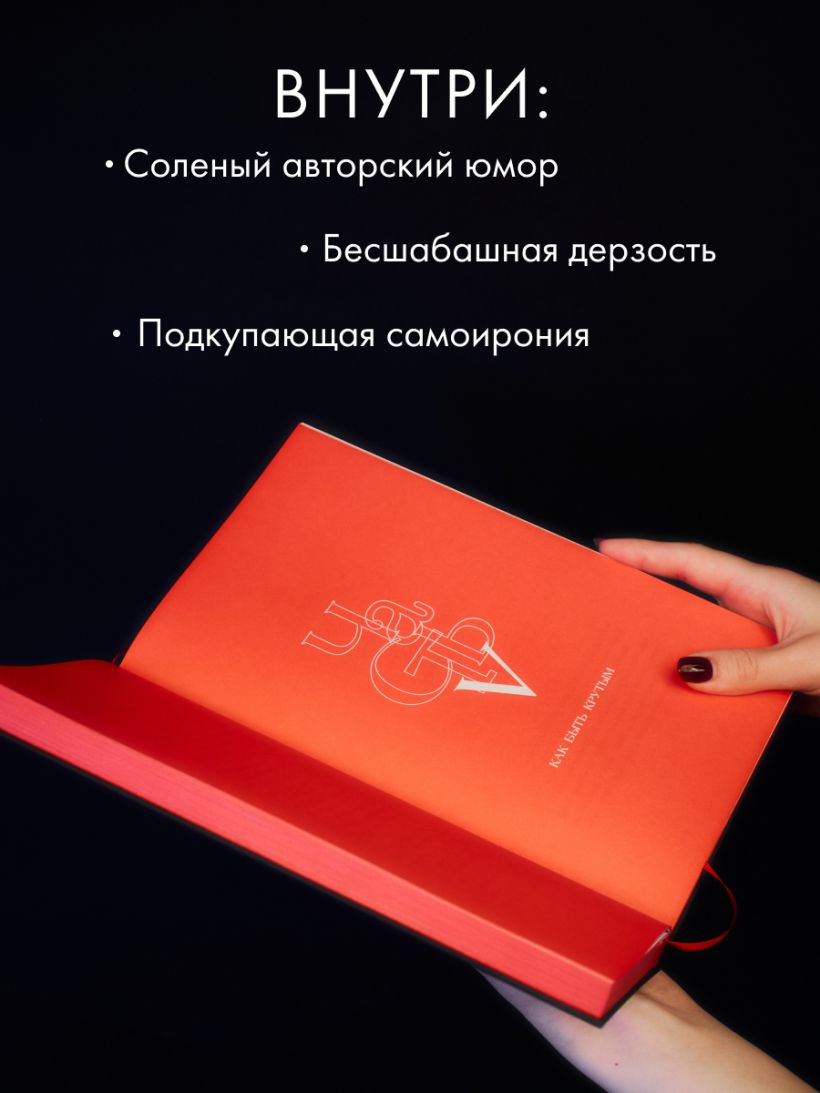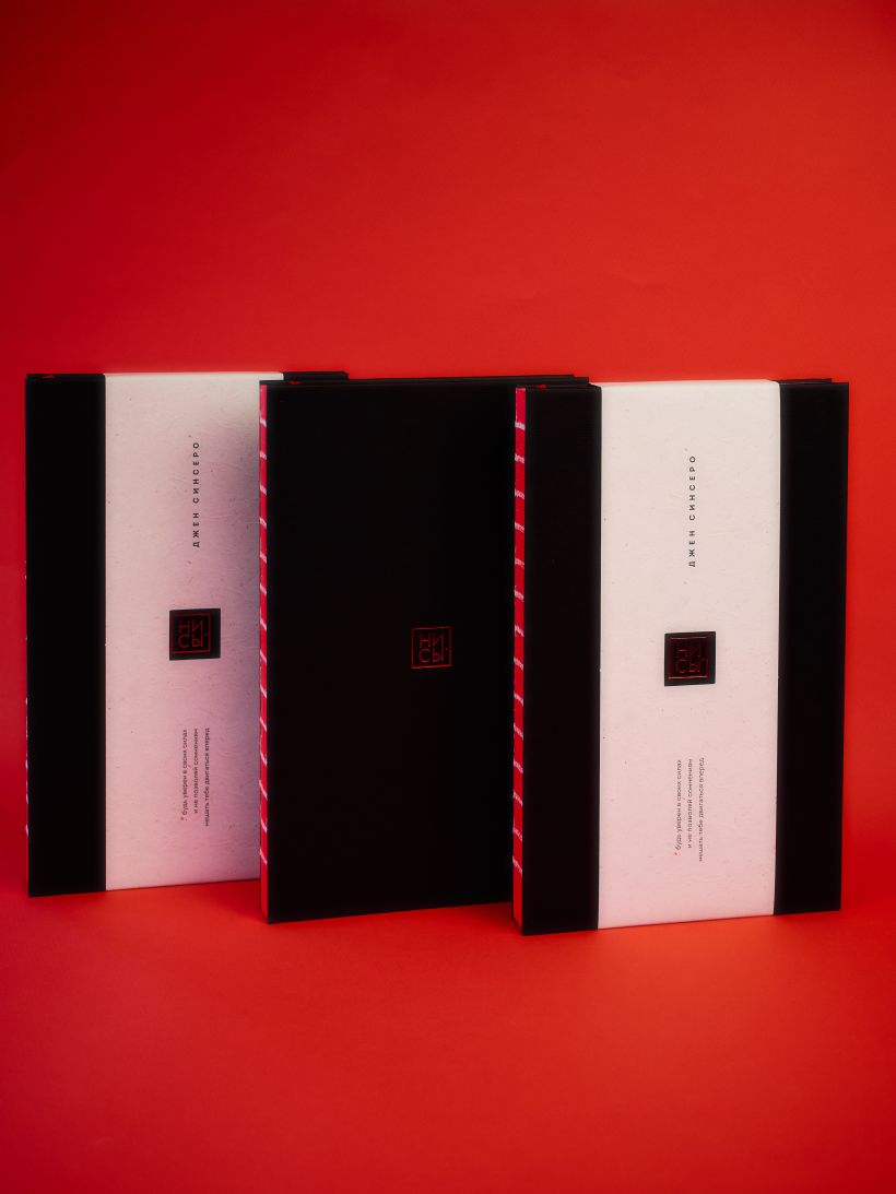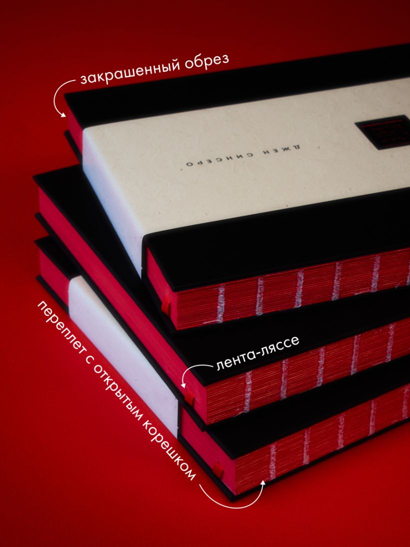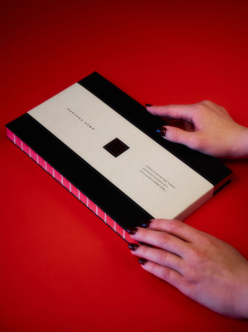 Элитный и минималистичный переплет с открытым корешком и красным закрашенным обрезом со всех 4-х сторон. На обложке изображен штамп-название, тисненный красной глянцевой фольгой по черному тактильному эфалину.