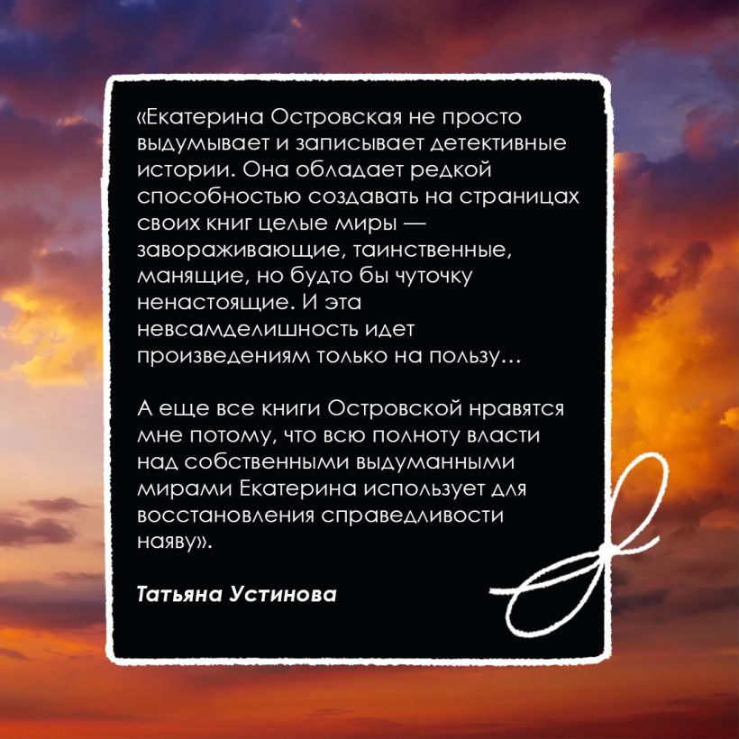 Татьяна Устинова рекомендует: «Екатерина Островская не просто выдумывает и записывает детективные истории. Она обладает редкой способностью создавать на страницах своих книг целые миры — завораживающие, таинственные, манящие, но будто бы чуточку ненастоящие. И эта невсамделишность идет произведениям только на пользу… А еще все книги Островской нравятся мне потому, что всю полноту власти над собственными выдуманными мирами Екатерина использует для восстановления справедливости наяву».