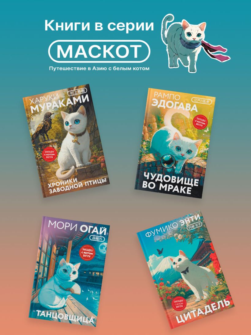 Белый кот Мичи — маскот серии. Вместе с вами он оправится в книжное путешествие по странам Азии: от чарующей Японии до загадочного Тайваня. Мичи будет поджидать вас на страницах книги. Вместе с ним вы разделите впечатления от прочитанного. На память о путешествии Мичи подарит коллекционную закладку.