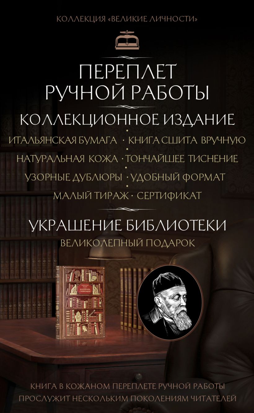 Коллекционное издание в серии «Великие личности», включающей в себя 21 том знаменитых сочинений крупнейших философов, ученых, писателей и военачальников прошлых веков и нового времени в популярном изложении. Издание в переплёте ручной работы отпечатано на бумаге премиум-класса цвета чайной розы и сшито вручную. Заявленный тираж 2020 года - 15 нумерованных экземпляров. В каждом экземпляре - избранные цитаты и гравированный портрет автора, отпечатанные на дизайнерской бумаге, изготовленной на четверть из натуральной кожи. Переплеты созданы по традиционной для 19 века технологии из гладкой натуральной кожи и украшены тремя видами рельефного тиснения - золотым. рельефным и красочным. Форзацы книги из дизайнерской тонированной бумаги и тиснёные золотом орнаментальные дублюры. Каптал и ляссе из шелка и трехсторонний торшонированный обрез.