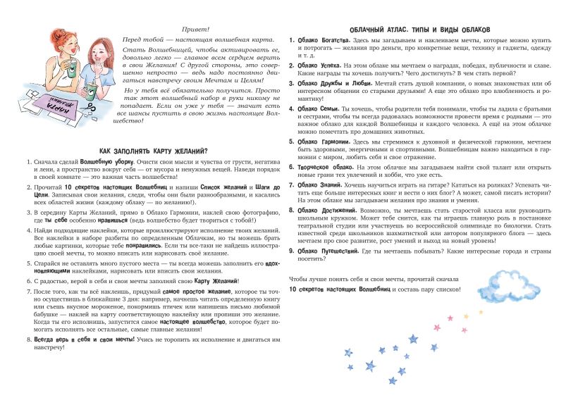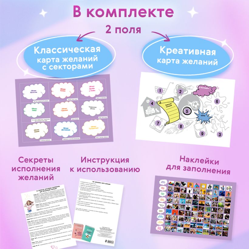 В набор входят: карта на плотной бумаге, подробная инструкция на двух листах, наклейки с фото желаний.