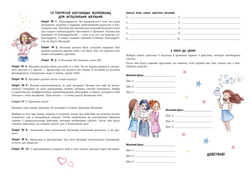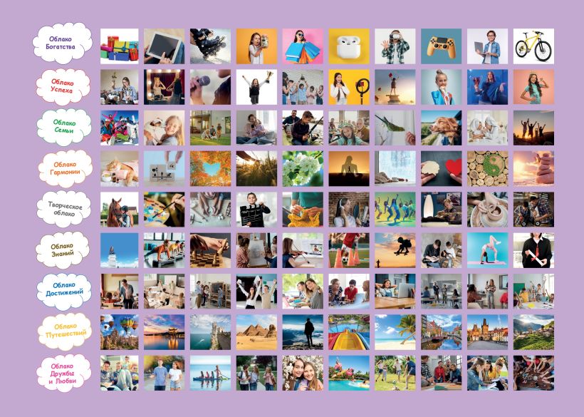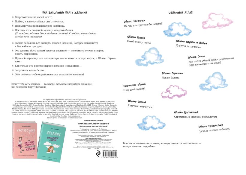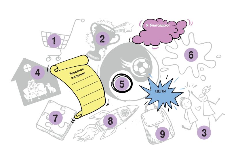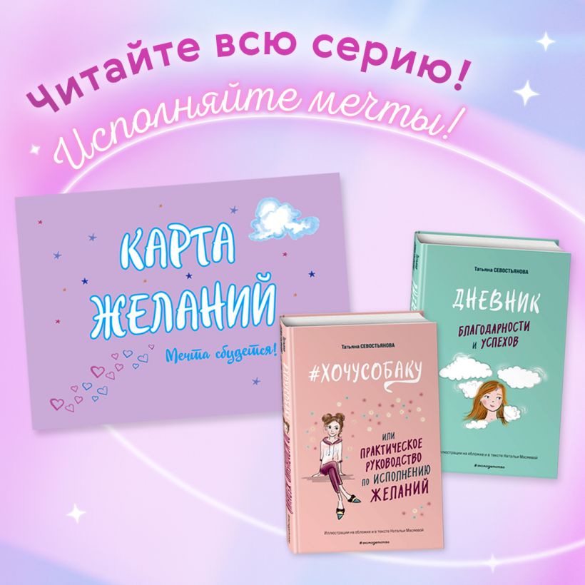 Ваш ребёнок мечтает объездить весь мир? А, может, он хочет стать известным актёром или блогером? Каждый родитель всем сердцем желает, чтобы его ребёнок умел добиваться своих целей и был счастлив. Но как нащупать тот путь, который поможет ребёнку достигнуть высот и исполнить все заветные желания? Его легче искать, когда есть карта! Теперь карта желаний разработана специально для детей! Визуализация желаний на карте — не только первый шаг к достижению цели, но и один из способов развить креативность! Её необычное оформление было разработано специально, чтобы дети могли визуализировать свой путь к успеху. В этой карте всего 9 секторов, разделённых по тематикам, и каждый из них нужно заполнить соответствующими наклейками с изображениями желаний, которые идут в комплекте. Так она призывает ребёнка тщательно обдумать свои желания и обрисовать свои возможности, которые он уже может использовать. Для помощи в заполнении карты можно привлечь другие книги серии: «# ХОЧУ СОБАКУ, или Практическое руководство по исполнению желаний», «Дневник благодарности и успехов».