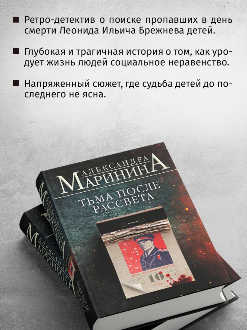 Первый ретро-детектив Александры Марининой. Удивительно точная атмосфера позднего СССР, настроения людей, их страхи и надежды. Уголовники, сотрудники милиции и КГБ, простые граждане и те, кто был допущен к «социалистической кормушке» - у каждого из них своя история и свои мотивы.