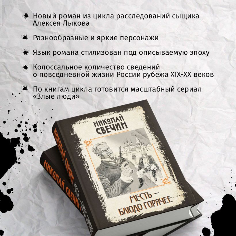 «В новом романе "Месть — блюдо горячее" автор мастерски воссоздаёт атмосферу Российской империи начала XX века, умело сплетая детективную интригу с историческими фактами.