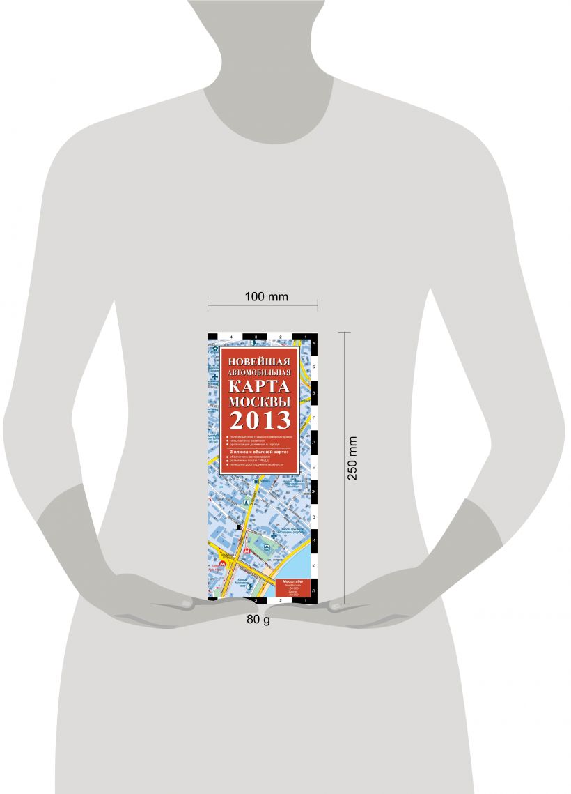 Подробный план города с номерами домов. Новые схемы развязок. Актуальная информация об организации движения в городе. 3 плюса к обычной карте: обозначены автозаправки. размечены посты ГИБДД. нанесены достопримечательности. Масштабы: Вся Москва 1:50 000; Цент 1:10000.