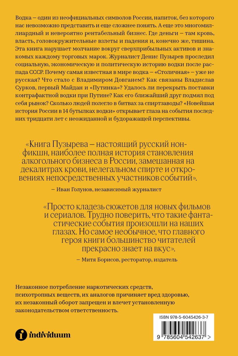 Журналист Денис Пузырев проследил социальную, экономическую и политическую историю водки после распада СССР. Почему самая известная в мире водка — «Столичная» — уже не русская? Что стало с Владимиром Довганем? Как связаны Владислав Сурков, первый Майдан и «Путинка»? Удалось ли перекрыть поставки контрафактной водки при Путине? Как его ближайший друг подмял под себя рынок? Сколько людей полегло в битвах за спиртзаводы? «Новейшая история России в 14 бутылках водки» открывает глаза на события последних тридцати лет с неожиданной и будоражащей перспективы.