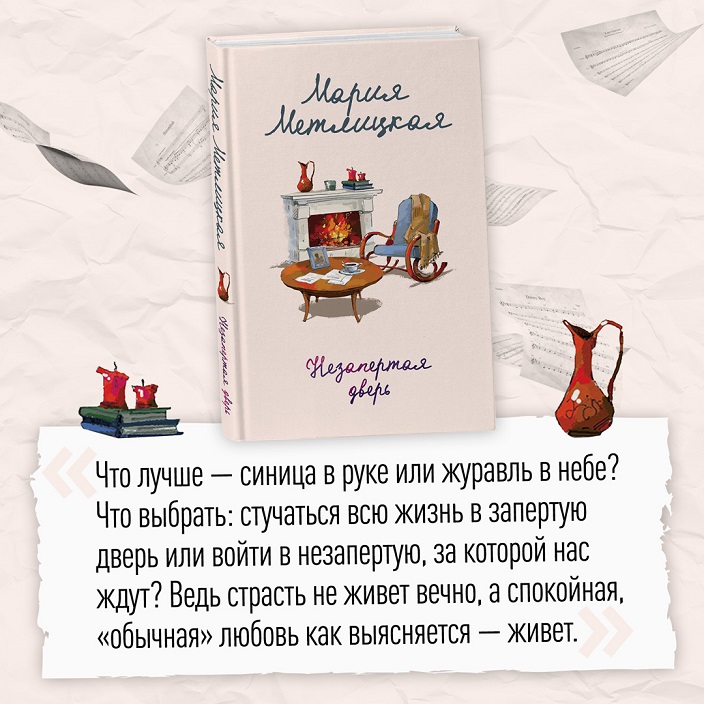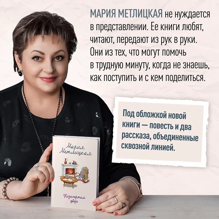 Мария Метлицкая не нуждается в представлении. Ее книги любят, читают, передают из рук в руки. Они из тех, что могут помочь в трудную минуту, когда не знаешь, как поступить и с кем поделиться.