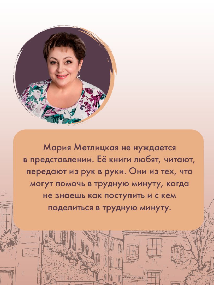 Женские судьбы всегда в центре внимания Марии Метлицкой. Каждая читательница, прочтя ее книгу, может с уверенностью сказать, что на душе стало лучше и легче: теплая интонация, жизненные ситуации, узнаваемые герои — все это оказывает психотерапевтический эффект.