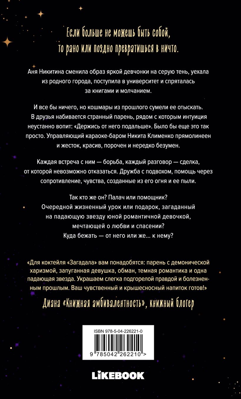 "Для коктейля «Загадала» вам понадобятся следующие ингредиенты: парень с демонической харизмой, запуганная девушка, обман, темная романтика и одна падающая звезда. Украшаем слегка подгорелой правдой и болезненным прошлым. Ваш чувственный и крышесносный напиток готов!" - Диана «Книжная амбивалентность», книжный блогер.