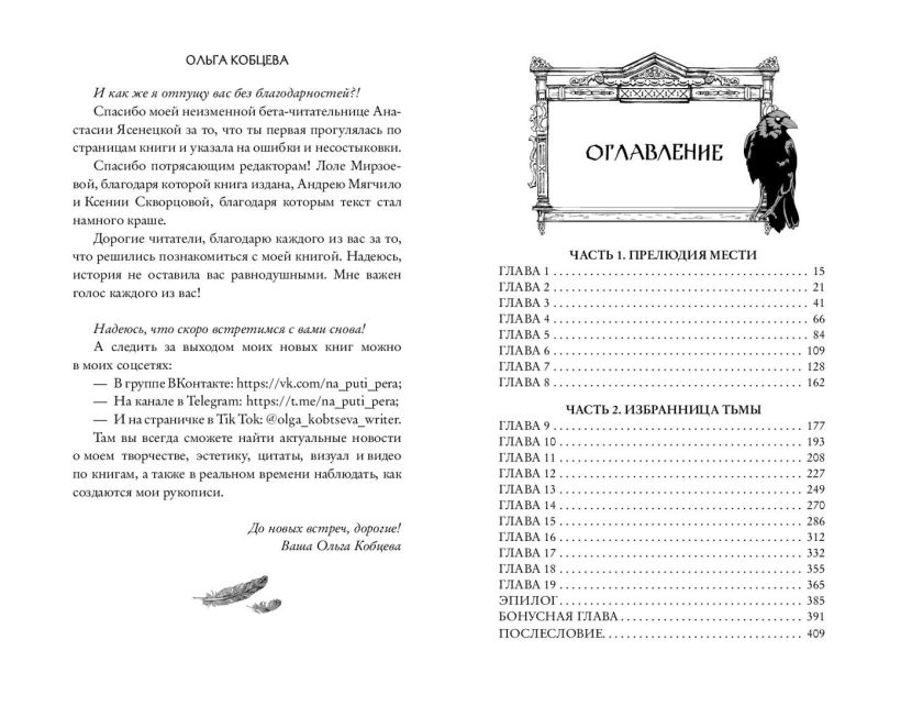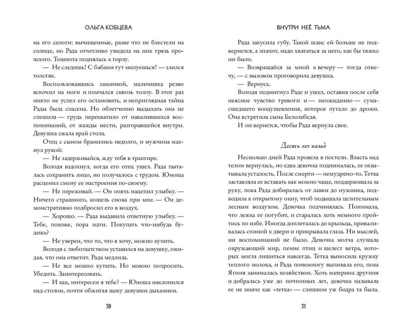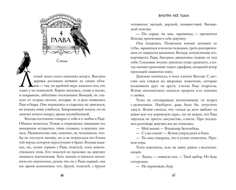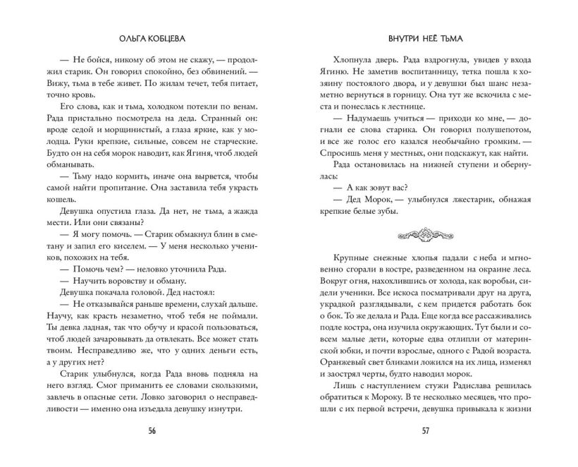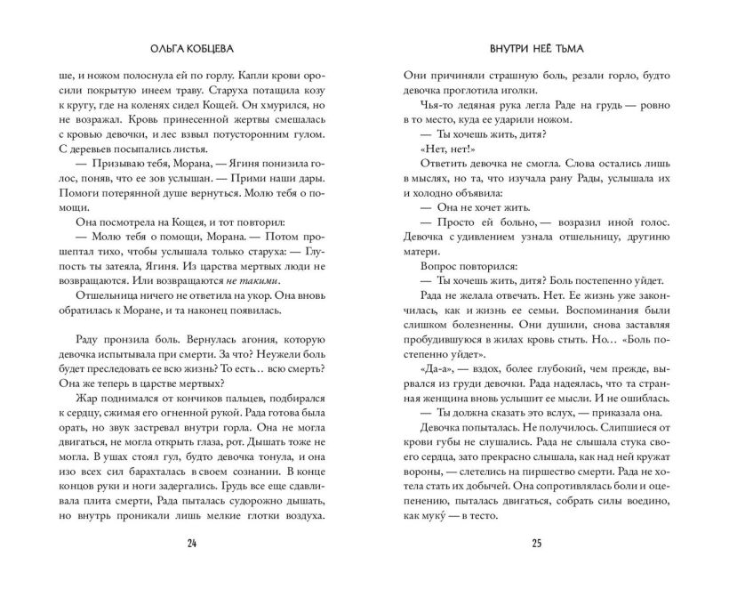 Очень необычно, когда главную героиню книги убивают в первой главе, как в истории Ольги Кобцевой «Внутри неё тьма». Оживляет ее Ягиня, но конечно не просто так. Начало истории очень мрачное, хотя автор и предупреждает, но когда это кого останавливало? Точно не меня, если что я решила). В целом, книга о выборе цели и ценностей в жизни. Но мне не зашла концепция мести, на мой взгляд она очень непродуманная со стороны героини. Озадачивает подход "старших". Наверное это непринятие умом, помешало насладиться полностью этой взрослой сказкой в славянском стиле.
