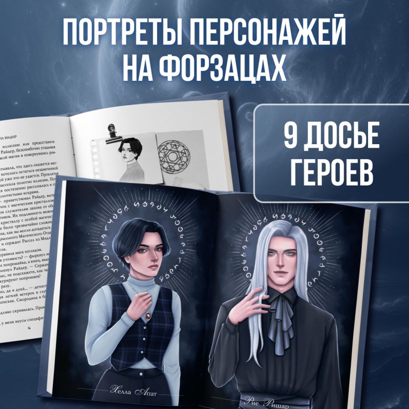В макете есть девять досье героев, а на форзацах четыре портрета главных героев. Все отрисовано самим автором!