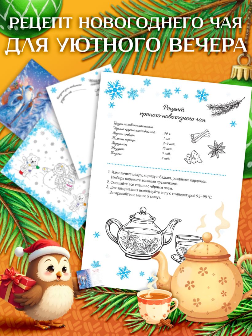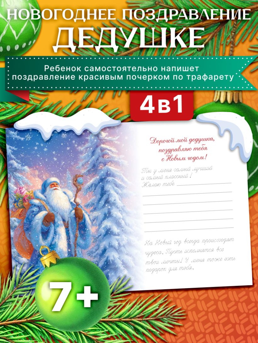 Новогодний набор для творчества «Новогоднее поздравление дедушке» — это тематический подарочный набор для детей, позволяющий подготовить трогательное поздравление и создать атмосферу зимнего праздника в кругу семьи. В комплект входит письмо с изображением Деда Мороза, которое нужно заполнить, следуя пунктирным прописным буквам и добавляя свой текст, а затем раскрасить на обороте рисунок с новогодним сюжетом. На втором листе дано свободное место для рисунка в подарок дедушке, а на обратной стороне размещен рецепт ароматного новогоднего чая, который дети могут приготовить совместно с дедушкой, превращая презент в волшебный семейный подарок. Все элементы набора стимулируют внимание, логику и навыки письма. Благодаря простому формату и содержательному наполнению комплект станет тёплым, душевным новогодним подарком дедушке от внуков. Этот новогодний набор для творчества для малышей и школьников 7 – 8 – 9 – 10 – 11 лет объединяет создание творческого поздравления и совместное времяпрепровождение, делая подготовку к празднику увлекательной и незабываемой.