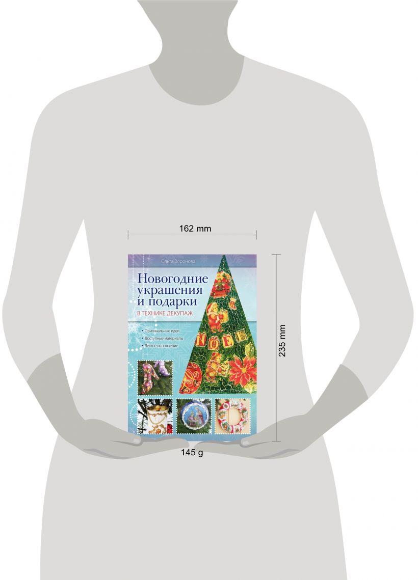 В преддверии новогодних праздников так хочется украсить дом, нарядить елку, подготовить подарки для родных и друзей! К сожалению, именно в это время в магазинах выстраиваются огромные очереди, а предлагаемые производителями товары зачастую безвкусны и неоправданно дороги. Возможно, именно поэтому многие рукодельницы все чаще отказываютсяот от покупных украшений и подарков и предпочитают в период предновогодней суеты заняться творчеством, получая огромное удовольствие от процесса и не меньшее наслаждение от результатов своего труда. Если вы любите делать что-то своими руками и хотите незабываемо встретить Новый год, предлагаем вам обратить свое внимание на декупаж – невероятно красивую и при этом несложную в освоении декоративную технику, позволяющую за считанные минуты преварщать обычные вещи в произведения искусства. На страницах этой книги вы найдете порядка двадцати отличных новогодних идей по изготовлению елочных украшений, подарочной упаковки, элементов сервировки праздничного стола, полезных и красивых сувениров, и на любую из них вы потратите максимум 1,5–2 часа. Пошаговые инструкции и большое количество поясняющих иллюстраций от известного российского дизайнера и телеведущей Ольги Вороново позволят легко справиться с любой из представленных в книге моделей даже тем, кто никогда раньше не занимался декупажем.