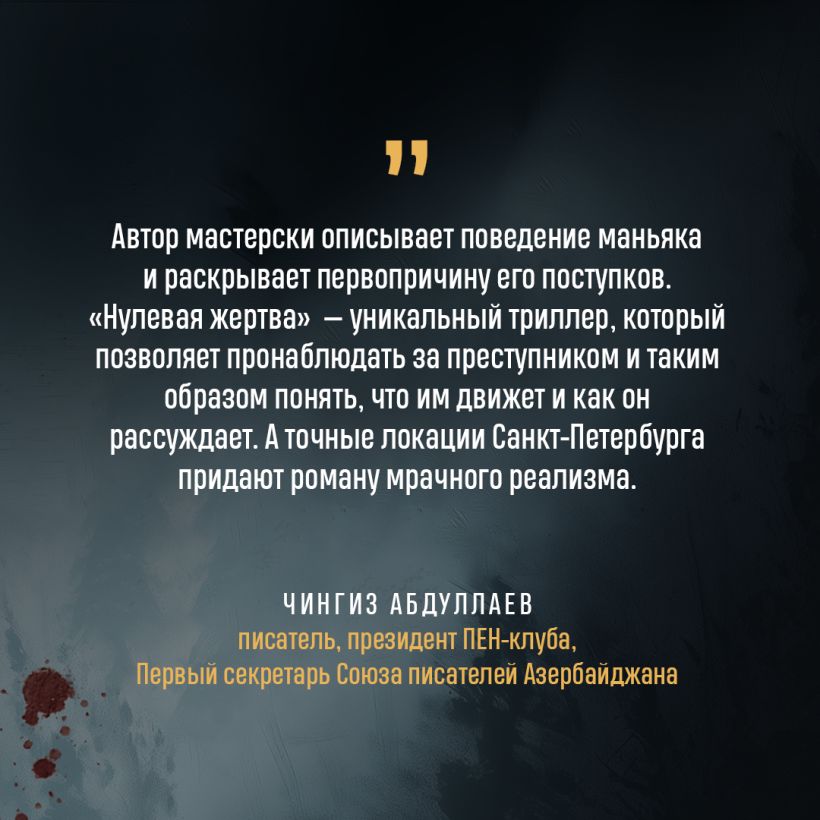«Автор мастерски описывает поведение маньяка и раскрывает первопричину его поступков. "Нулевая жертва" — уникальный триллер, который позволяет пронаблюдать за преступником и таким образом понять, что им движет и как он рассуждает. А точные локации Санкт-Петербурга придают роману мрачного реализма». — Чингиз Абдуллаев, писатель, президент ПЕН-клуба, Первый секретарь Союза писателей Азербайджана