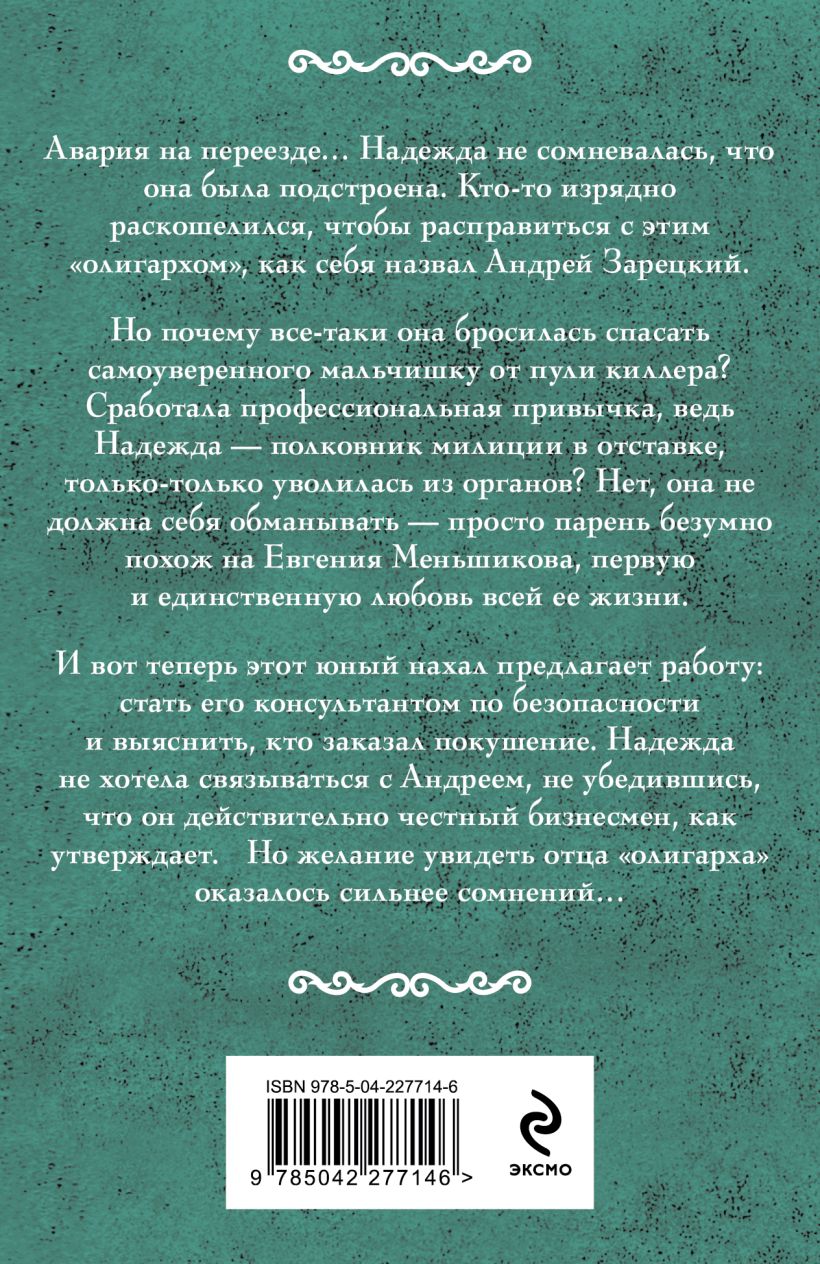 Авария на переезде… Надежда не сомневалась, что она была подстроена. Кто-то изрядно раскошелился, чтобы расправиться с этим «олигархом», как себя назвал Андрей Зарецкий. Но почему все-таки она бросилась спасать самоуверенного мальчишку от пули киллера? Сработала профессиональная привычка, ведь Надежда — полковник милиции в отставке, только-только уволилась из органов? Нет, она не должна себя обманывать — просто парень безумно похож на Евгения Меньшикова, первую и единственную любовь всей ее жизни. И вот теперь этот юный нахал предлагает работу: стать его консультантом по безопасности и выяснить, кто заказал покушение. Надежда не хотела связываться с Андреем, не убедившись, что он действительно честный бизнесмен, как утверждает. Но желание увидеть отца «олигарха» оказалось сильнее сомнений…