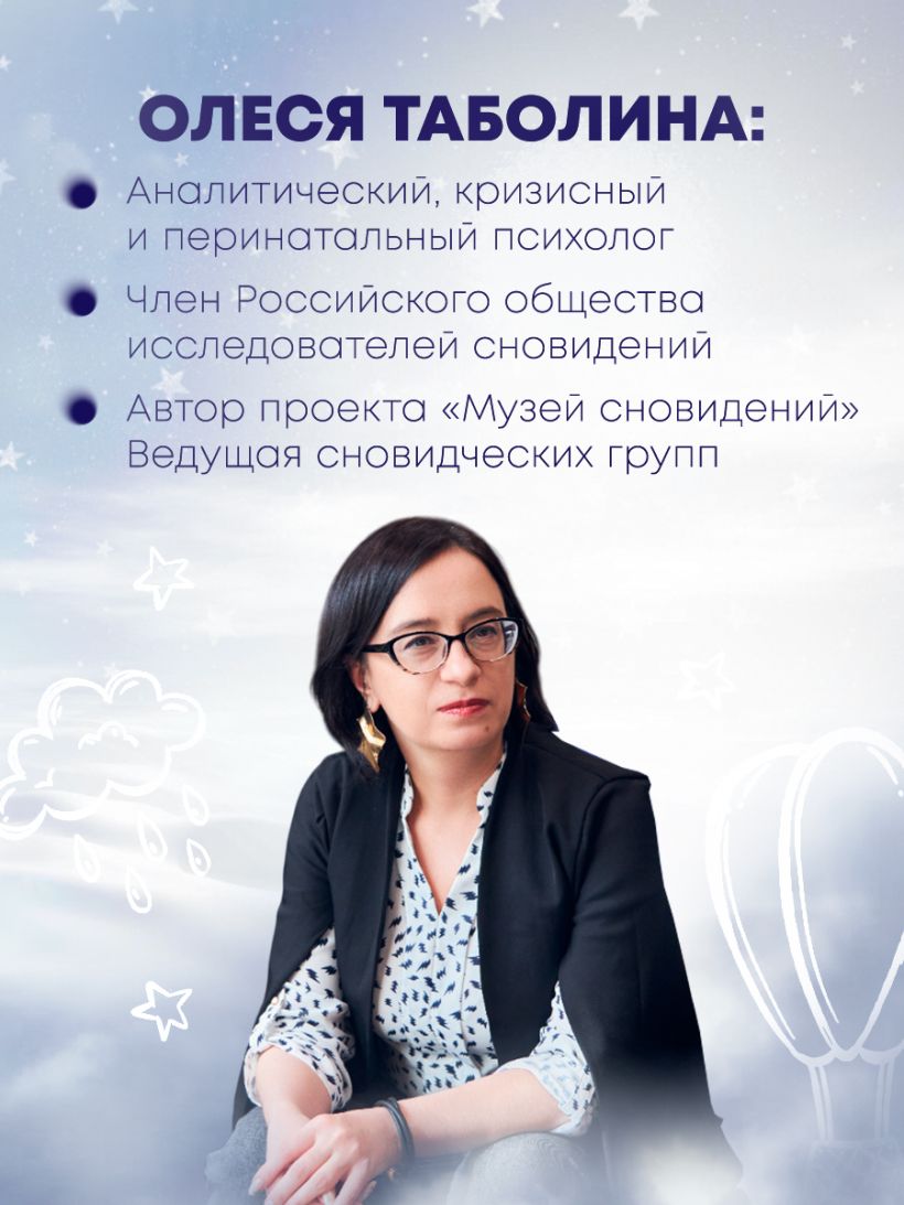 Олеся Таболина — аналитический, кризисный и перинатальный психолог, член российского общества исследователей сновидений и профессионального сообщества аналитических психологов, ведущая сновидческих групп, автор проекта «Музей сновидений».