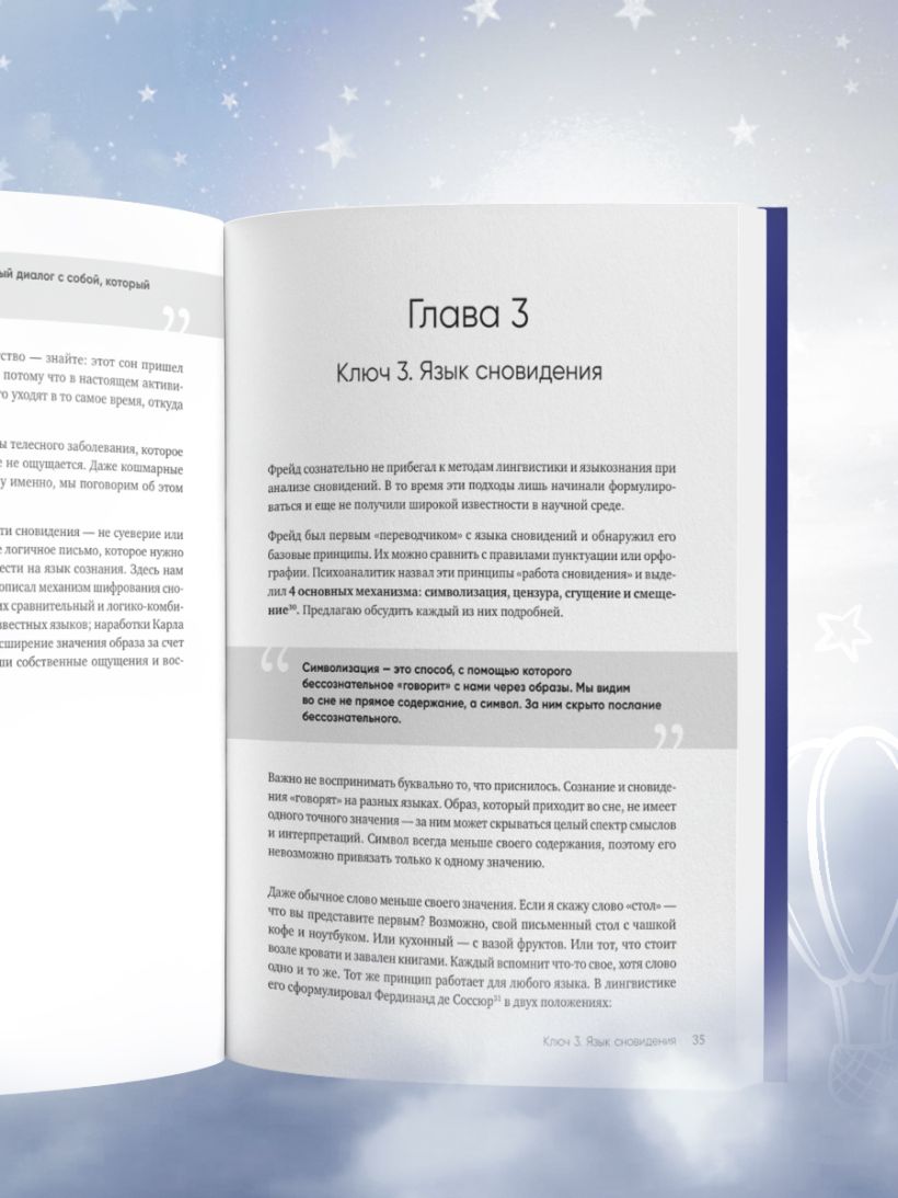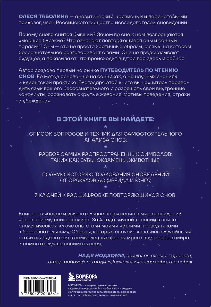 Автор создала первый на рынке ПУТЕВОДИТЕЛЬ ПО ЧТЕНИЮ СНОВ. Ее метод основан не на сонниках, а на научных знаниях и клиентской практике. Благодаря этой книге вы научитесь переводить язык вашего бессознательного и разрешать свои внутренние конфликты, осознавать скрытые желания, мотивы поведения, страхи и убеждения.