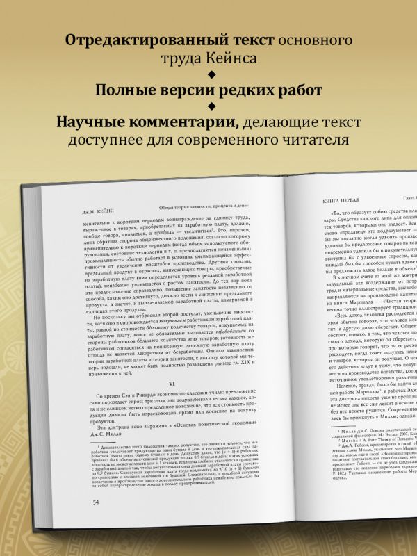 В издание также включены «Трактат о денежной реформе», «Экономические последствия валютной политики мистера Черчилля» и статьи — «Конец laissez-faire» и «Общая теория занятости». Особую ценность представляют собой материалы из Российского государственного архива экономики, связанные с пребыванием Кейнса в Советской России в 1925 г.