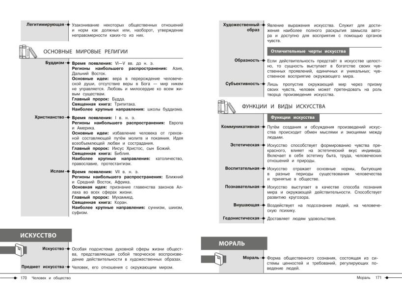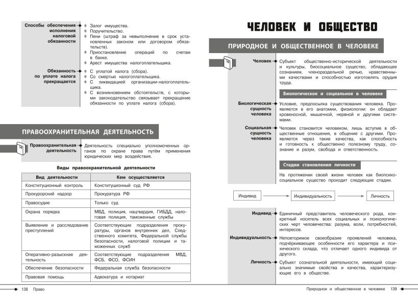 Справочник содержит важные материалы, которые помогут даже в сжатые сроки подготовиться к урокам, ОГЭ и ЕГЭ по обществознанию. Теория школьного курса изложена в наглядной форме и дополняется блоком практических заданий c ответами для комплексного закрепления знаний. Информация представлена в максимально удобной и эффективной для изучения и запоминания форме — в схемах и таблицах, что обеспечит плодотворную и быструю подготовку к урокам, контрольным и различным экзаменам. В пособии можно найти все основные разделы предмета: «Человек и общество», «Экономика», «Социальные отношения», «Политика», «Право». В книге ученики 6-7-8-9-10-11 классов найдут много полезного для своего образования. Книжка станет незаменимым помощником для всех, кто хочет подтянуть свои знания или вспомнить уже изученные темы, подготовиться к урокам и экзаменам, а также будет прекрасным дополнением к учебнику и просто облегчит процесс учебы. Справочник будет полезен и для занятий родителей с детьми.