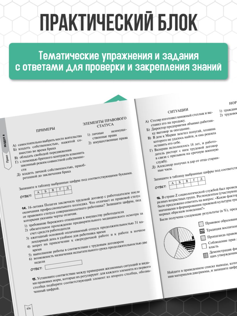 Данный справочник — идеальный вариант для тех, кто стремится сдать экзамен на «отлично», потому что он сочетает в себе глубокую теоретическую базу, как в учебнике, с обширной практической частью. Каждый раздел книги тщательно проработан опытным специалистом и преподавателем, чтобы помочь вам разобраться даже в самых сложных аспектах обществознания!