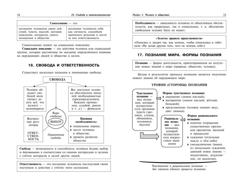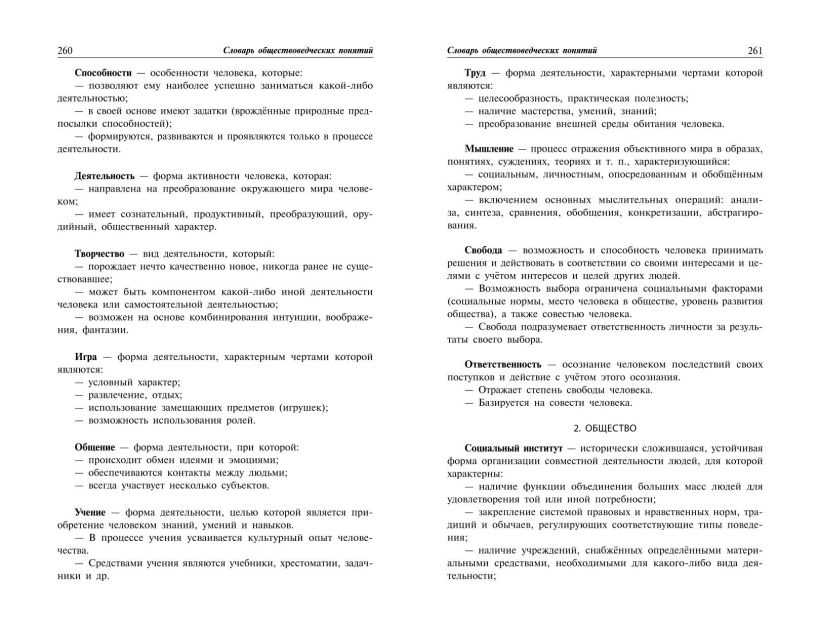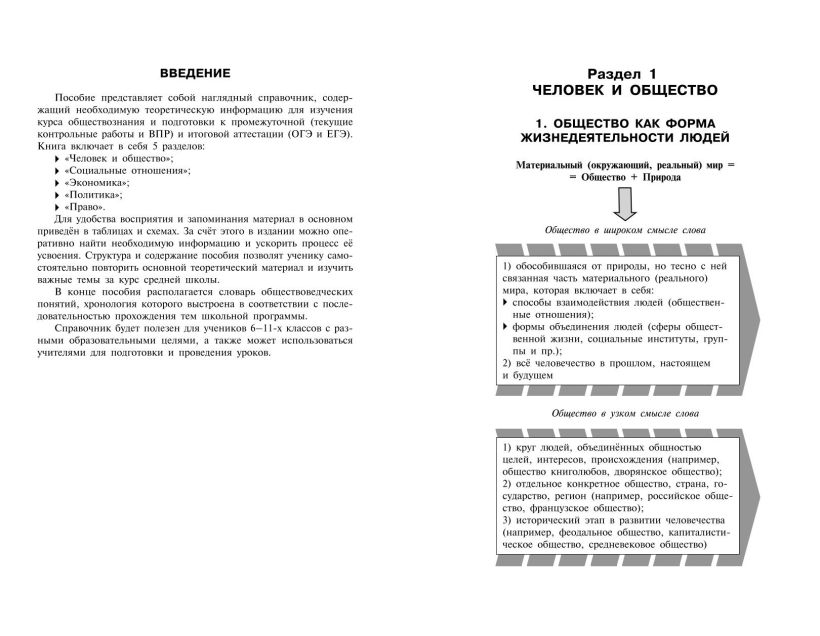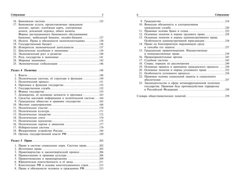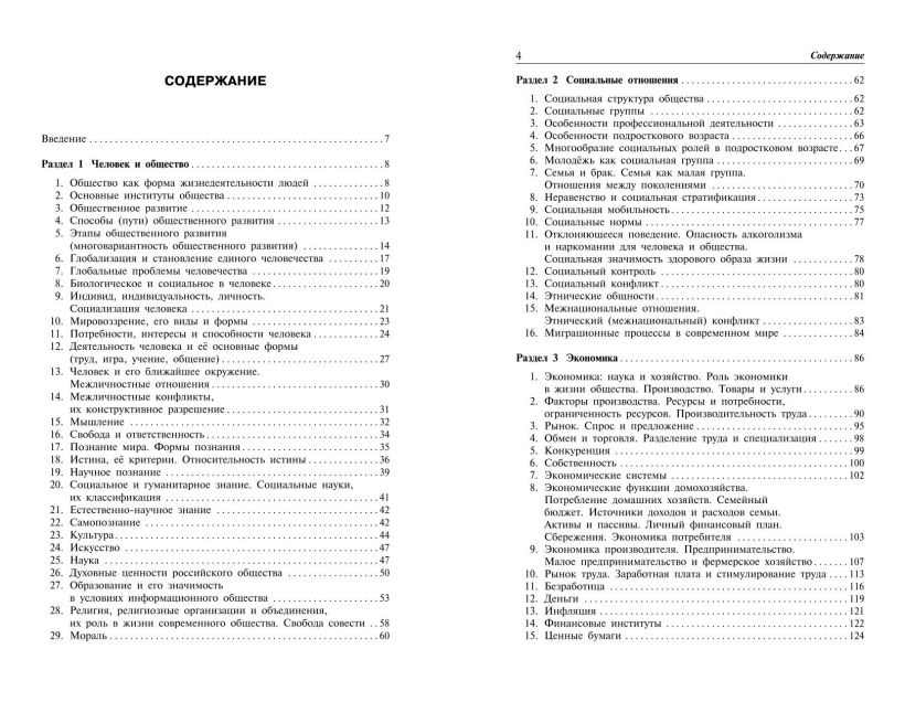 В издании вы найдёте сведения по 5 разделам: «Человек и общество», «Социальные отношения», «Экономика», «Политика», «Право». В конце книги приводится словарь обществоведческих понятий, знание которых проверяется на экзаменах.