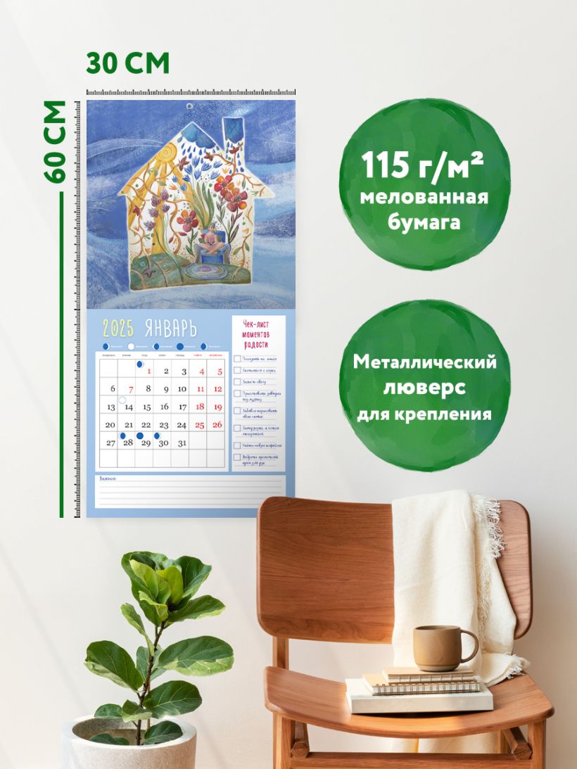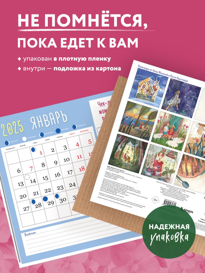 В календарной сетке специально для твоего удобства мы отметили новолуния и полнолуния, чтобы ты могла сверить свое расписание с космическим. И выбрать для «сбора счастья» самые лучшие дни. Календарь украшен волшебными иллюстрациями Ольги Кругловой, которые согреют и поддержат тебя в любой ситуации.