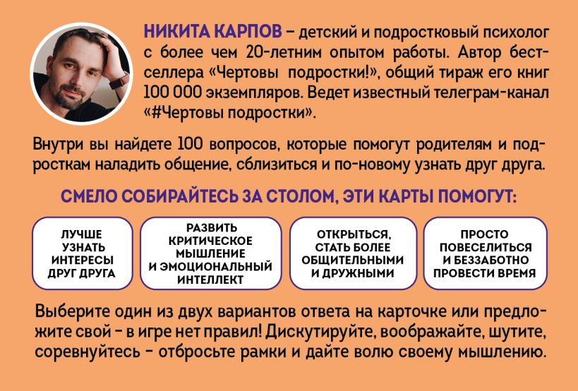 100 игровых карт, которые помогут наладить общение, укрепить доверие и по-новому узнать вашего подростка. Все вопросы составлены детским и подростковым психологом Никитой Карповым, который хорошо знает, с какими трудностями сталкиваются взрослеющие дети. Подростки постепенно отдаляются от родителей, хранят свои интересы в секрете и боятся делиться чувствами со взрослыми. Поэтому так важно поддерживать близкий контакт и проводить время вместе, получая положительные эмоции.