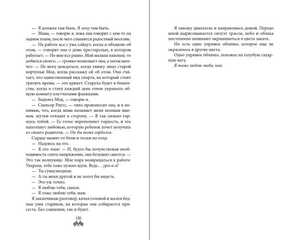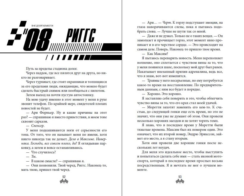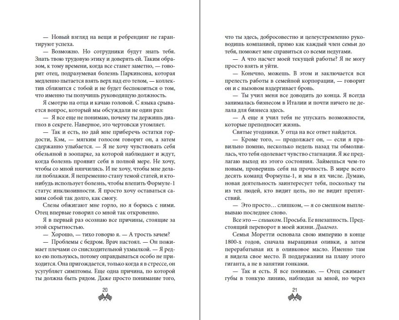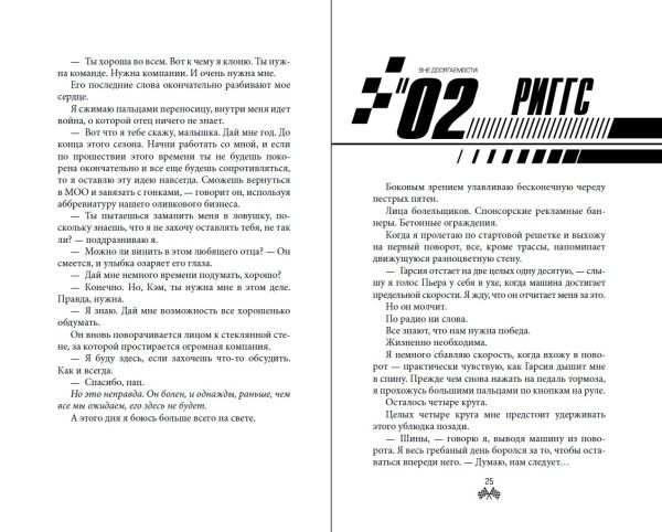 Когда тяжелобольной отец просит меня занять его место управляющего командой «Формулы-1», я соглашаюсь. Возможно, это его последняя просьба, и я сделаю все, чтобы сдержать обещание. Даже если на моем пути встанет горячий гонщик. Звезда «Формулы-1» Спенсер Риггс напорист в своем стремлении к победе. Этот самоуверенный новенький ведет себя так, словно все здесь уже принадлежит ему, включая дочь босса. Сын знаменитого гонщика прошлого, Риггс во что бы то ни стало хочет выйти из тени отца, иногда прибегая ради этого к по-настоящему рискованным приемам. У меня есть причины не доверять гонщикам, и я предпочитаю не подпускать Риггса близко. Но когда он целует меня, плохие воспоминания из прошлого незаметно отступают, и сдерживать обещание становится все сложнее. Но ради Риггса я готова рискнуть всем. Вопрос только в том, рискнет ли он всем ради меня?