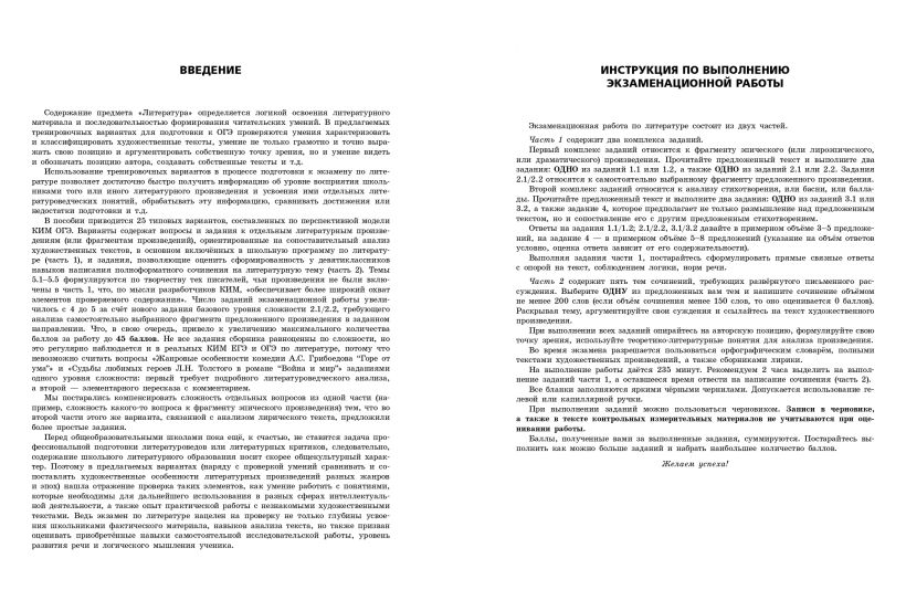 Пособие содержит 25 тренировочных вариантов по литературе, соответствующих структуре экзаменационной работы и составленных с учетом требований ОГЭ. Каждый вариант включает задания разных типов и уровней сложности.