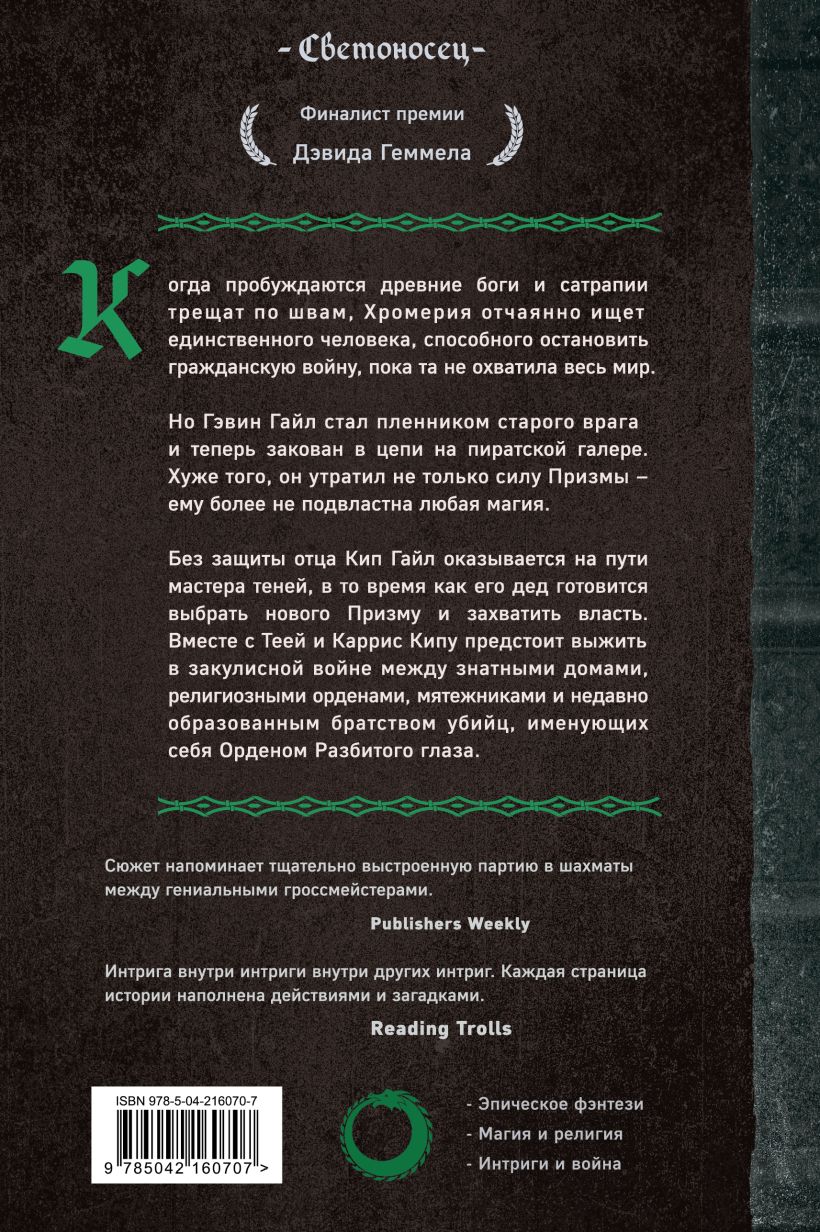Тем временем Владыка Цвета продолжает стремительное наступление: он уже покорил две из семи Сатрапий и теперь приближается к границам Кровавого Леса. В тенях орудуют безжалостные ассасины Ордена Разбитого глаза. Отчаявшийся Андросс Гайл решает использовать своих внуков — Кипа и его безжалостного единокровного брата Зимуна, — чтобы остановить вторжение. Но борьба между ними превращается в беспощадное соперничество за звание следующего Призмы.