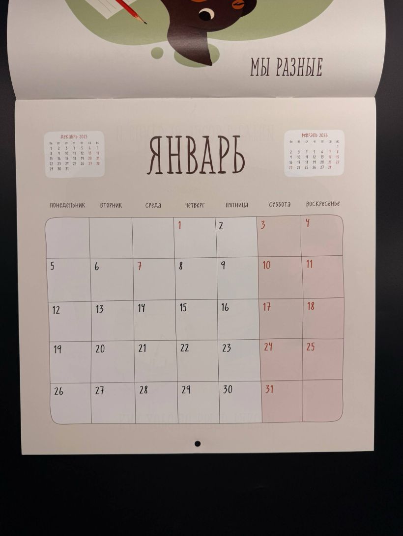 Календарь Татьяны Мужицкой с яркими иллюстрациями от Влады Коваль! В сетке — вдохновляющие цитаты автора и необычные праздники вроде «Всемирного дня “Спасибо”» и «Международного дня заботы о себе». Каждый месяц — как напоминание: жить можно с радостью, легкостью и любовью к себе. Совокупный тираж книг Татьяны Мужицкой — 360 000 экземпляров. Наши настенные календари отличаются высоким качеством исполнения! Тщательно подобранные иллюстрации, напечатанные на глянцевой бумаге высочайшего качества, станут настоящим украшением дома, а в календарной сетке найдется место для ваших планов: большие клетки позволят делать записи и организовать свой год! В серии настенных календарей издательства «ЭКСМО» каждый найдет тему по вкусу: великие художники, великолепные подборки с самыми знаменитыми произведениями искусства, легендарные кинематографические саги и игры, главные книжные авторы и бестселлеры, фотографии и иллюстрации любимых животных и многое-многое другое! Технические параметры: - Тип календаря — настенный перекидной. - Год — 2026. - Календарная сетка — с разбивкой по месяцам. - Вид скрепления — скрепка. - Ширина — 30 см. - Высота — 30 см. - Внутренний блок — мелованная бумага 150 г/м2. - Подложка — плотный гофрокартон для поддержания формы. - Индивидуальная упаковка в плотный целлофановый пакет.