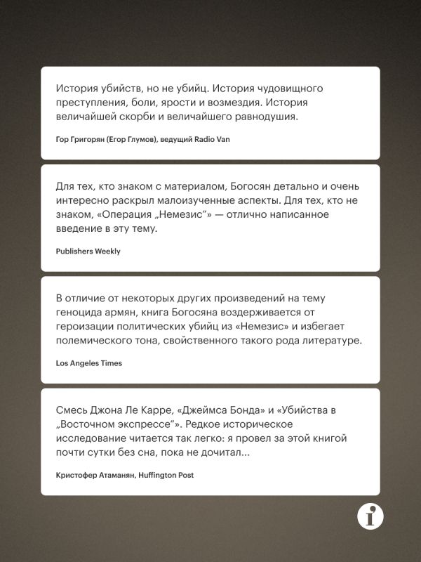 Весной 1921 года в Берлине армянин Согомон Тейлирян застрелил Мехмеда Талаат-пашу, бывшего великого визиря Османской империи и одного из инициаторов геноцида армян 1915 года, унесшего жизни более миллиона человек. Тогда никто не знал, что убийца действовал не один. За ним стояла тайная организация, миссией которой была месть ответственным за геноцид. В честь греческой богини возмездия организация получила название «Немезис». Опираясь на множество исторических источников, Эрик Богосян, американский драматург, режиссер и актер, потомок выжившего во время геноцида, бесстрастно и подробно воссоздает историю этой секретной организации. История начинается за сотни лет до выстрела в Берлине, со сложного сосуществования турок-османов и армян в Малой Азии, и тянется в современность с ее тяжелым политическим наследием. Книга Богосяна — это одновременно захватывающий документальный триллер, собрание свидетельств об ужасающем преступлении и размышление о природе насилия, мести и памяти.