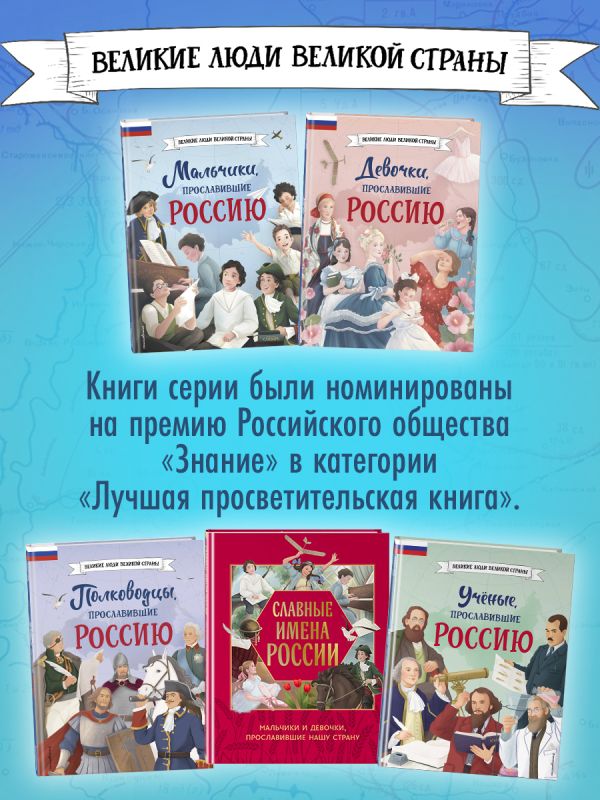 Отправляйтесь в захватывающее путешествие по разным эпохам нашей страны! Вы хотите познакомить вашего ребёнка с известными людьми России — княгиней Ольгой и Екатериной Дашковой, Галиной Вишневской и Мариной Цветаевой, Анной Павловой и Валентиной Терешковой? Узнать, во что играли будущие исторические личности? Чем увлекались в детстве? Как искали свою судьбу, искали себя на нелёгких жизненных дорогах? Ведь они так же, как и все мы, одолевали за партой неподдающиеся науки, отстаивали собственное мнение в спорах; у них были свои детские огорчения и радости. И далеко не всё получалось с первого раза... Тогда открывайте эту книгу! В каждом из 20 биографических рассказов, адаптированных для детей 7—10 лет, — невероятный образец силы воли и стойкости характера, мотивирующий девочек на собственные свершения. Их сопровождают красочные полосные иллюстрации и занимательные факты, чтобы знакомиться с выдающимися соотечественниками было наглядно и увлекательно. А ещё это неповторимый подарок для всех, кто гордится историей и культурой своего Отечества! Книги серии получили заслуженно высокую оценку — в 2024 году они были номинированы на премию Российского общества «Знание» в категории «Лучшая просветительская книга».