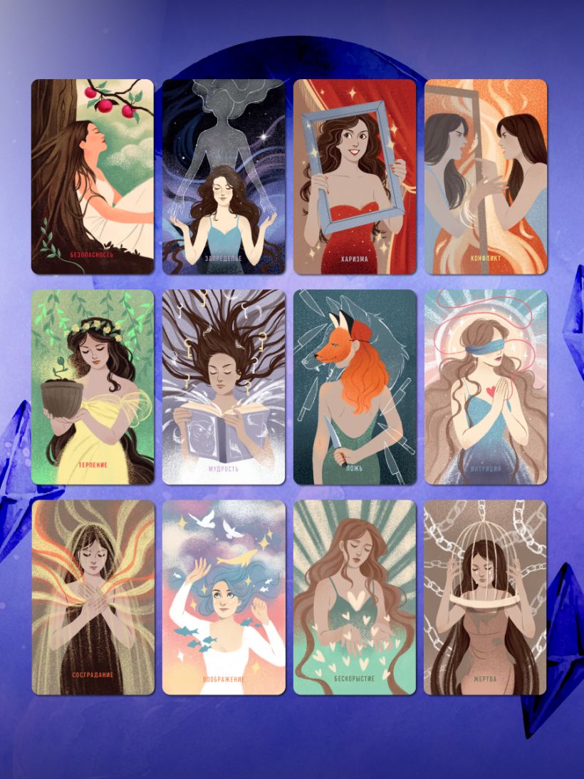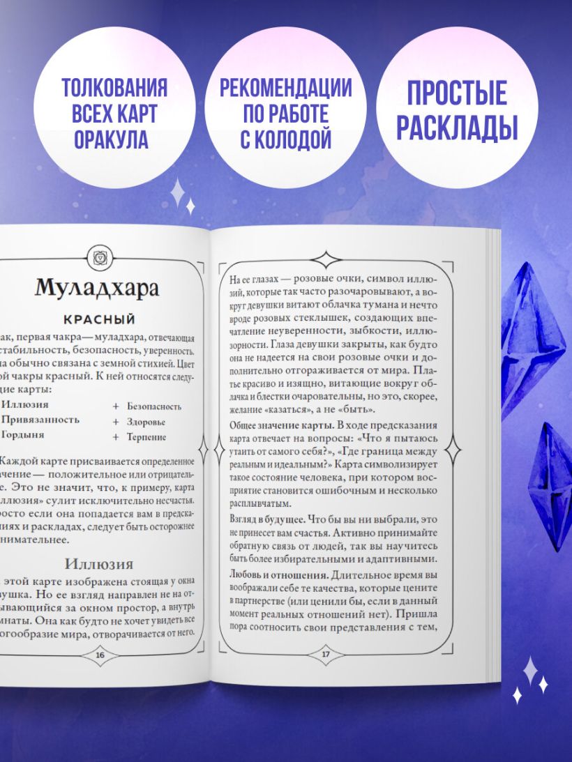 • Руководство с толкованием всех карт оракула для разных сфер жизни (любовь и отношения, финансы и работа, здоровье, характеристика личности, прогноз на будущее).