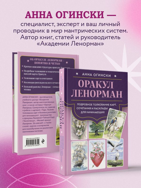 АННА ОГИНСКИ — руководитель учебного центра «Академия Ленорман», автор многочисленных книг, в числе которых «Оракул Ленорман. Самоучитель по гаданию и работе с картами», «Таро. Полное толкование карт и базовые расклады для начинающих», «Расклады Таро. Более 130 раскладов для самых важных вопросов», руководства к оракулам Ленорман «Тайный Сад», «Темнолесье», «Малый оракул Ленорман. 36 ключей», а также статей, курсов и материалов для самообучения по различным мантическим системам.