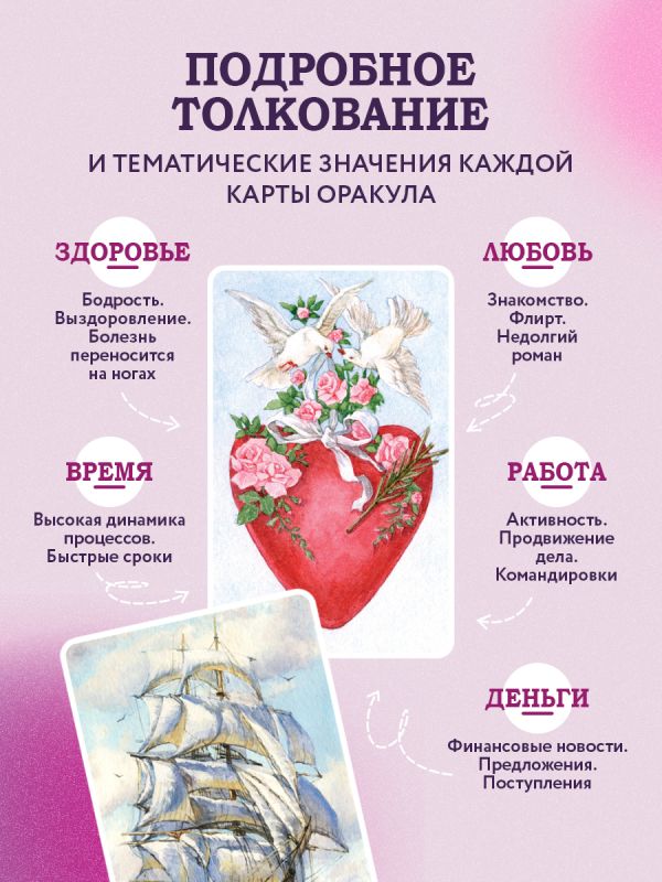 • Подробное толкование и тематические значения каждой карты Оракула.