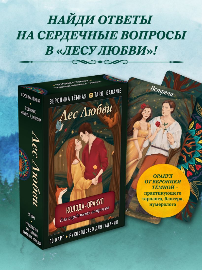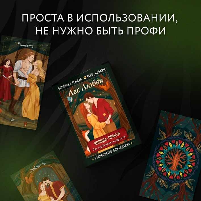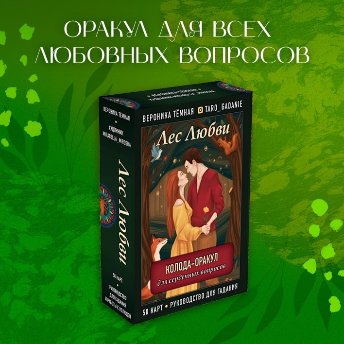 Авторский оракул «Лес любви» практикующего таролога и блогера Вероники Тёмной станет вашей путеводной нитью в сложной и запутанной сфере отношений. Он поможет разрешить проблемы выбора, поведает о чувствах другого человека к вам, осветит перспективы текущих отношений, их будущее, настоящее и прошлое, предупредит о грядущих потрясениях и радостях.