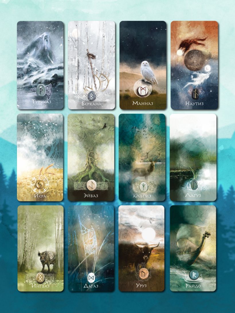• 24 карты-руны старшего футарка с атмосферными иллюстрациями Сары Мотте;