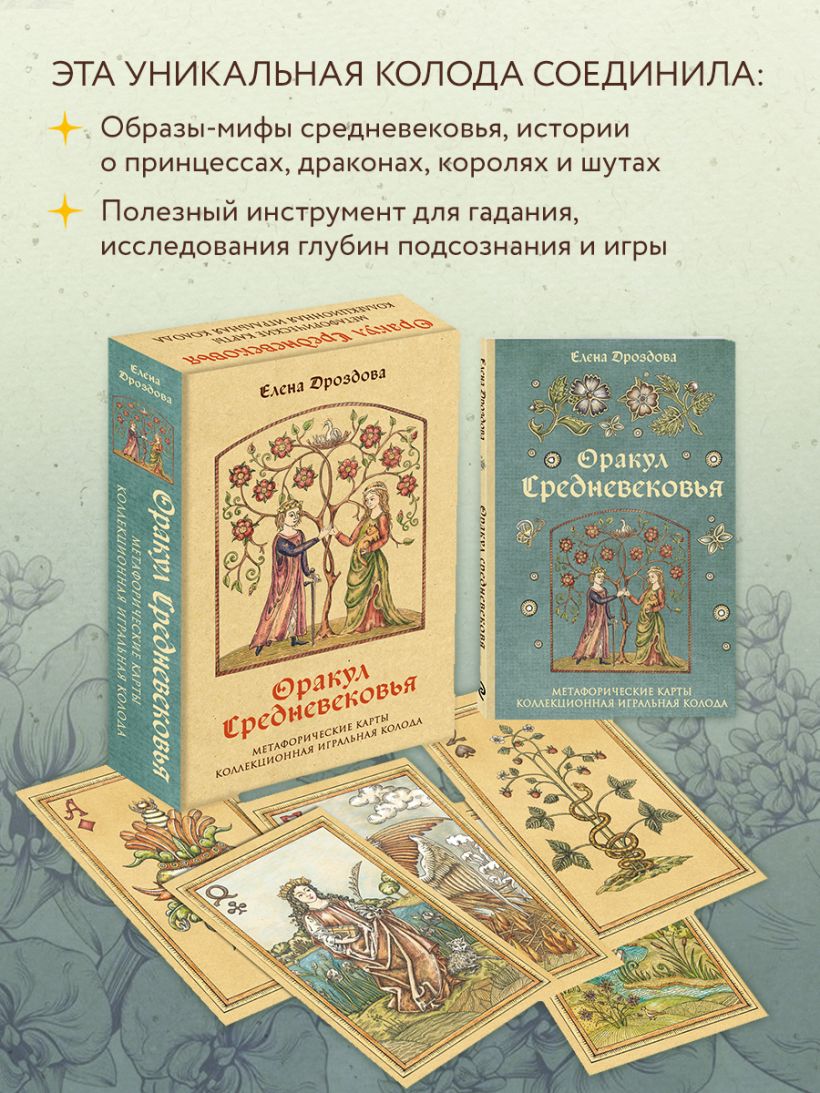 Оракул Средневековья - это уникальный авторский проект, в котором собраны базовые мифологические образы из событий эпохи средневековья и увлекательные истории о древних принцессах и драконах, о королях и шутах. Эти истории - не исследование культуры Средних веков. Это увлекательное чтение и полезный инструмент для гадания, исследования собственного подсознания и игры.