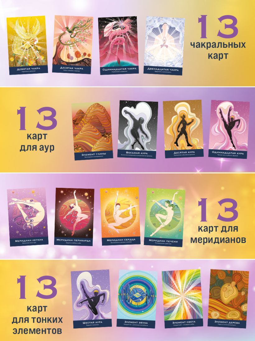 • 52 карты увеличенного формата с великолепными иллюстрациями Аделы Ли, позволяющие проработать все аспекты энергетической системы: 13 чакральных карт, 13 карт для аур, 13 карт для меридианов и 13 карт для тонких элементов.