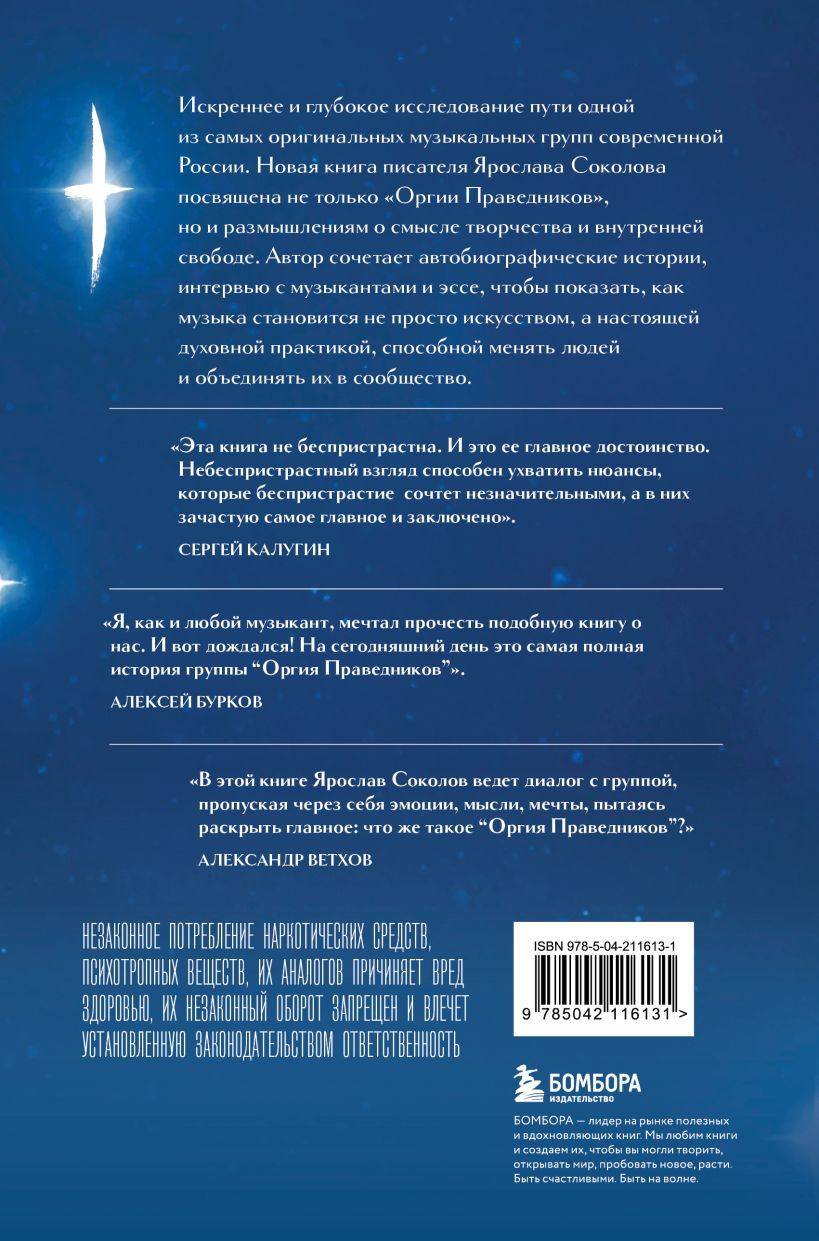 Ярослав Соколов создает яркие портреты всех участников “Оргии Праведников”, раскрывая их биографии, характеры и музыкальные пристрастия. Алексей Бурков - это человек контрастов, обладающий масштабной личностью, философским мышлением и трудоголизмом; Сергей Калугин — поэт с внутренней ранимостью, скрытой за маской брутальности; Тёма Бондаренко — основательный и харизматичный басист, отвечающий за стабильность; Саша Ветхов — барабанщик с уникальным стилем и внутренней силой. Каждый из них — отдельная вселенная, и только их сочетание рождает уникальное звучание ОП, которое поначалу может оттолкнуть, но при внимательном погружении открывает глубокий смысл и сложную гармонию, которые так ценят поклонники группы вот уже почти 30 лет.